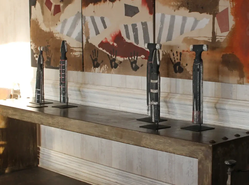 Los Onas o Selk’nam, fue un pueblo originario de nuestra región que habitó el norte de Tierra del Fuego. Estas piezas representan uno de los rituales más distintivos de los Selknam; la Ceremonia del Hain, ritual de iniciación de jóvenes a la vida adulta que legitimaba la autoridad masculina e involucraban la pintura corporal y la representación de espíritus.